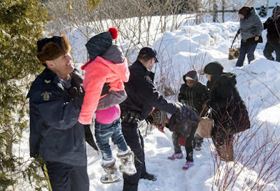 While some refugees are also crossing into Manitoba and British Columbia, according to the Canada Border Services Agency, some 452 people made refugee claims in Quebec in January alone, after being arrested for illegally crossing the border on foot with their strollers and suitcases in tow. Paradoxically, since the Safe Third Country Agreement between Canada and the U.S. came into force in 2004, people entering from the U.S. can only claim refugee status in Canada if they cross outside the designated ports of entry—in other words, illegally. —Montreal Gazette, February 16, 2017