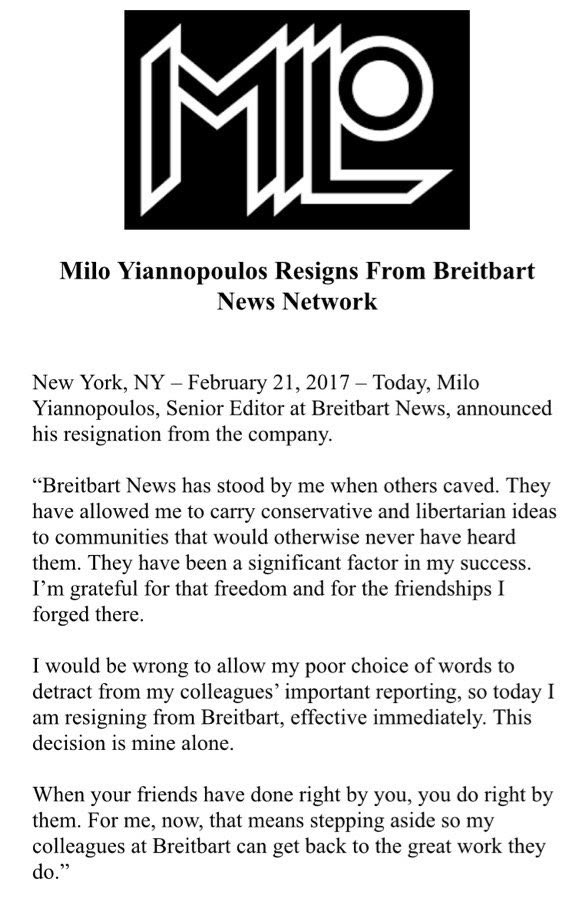 0 Response to "Rock Bottom! Milo resigns from Breitbart"